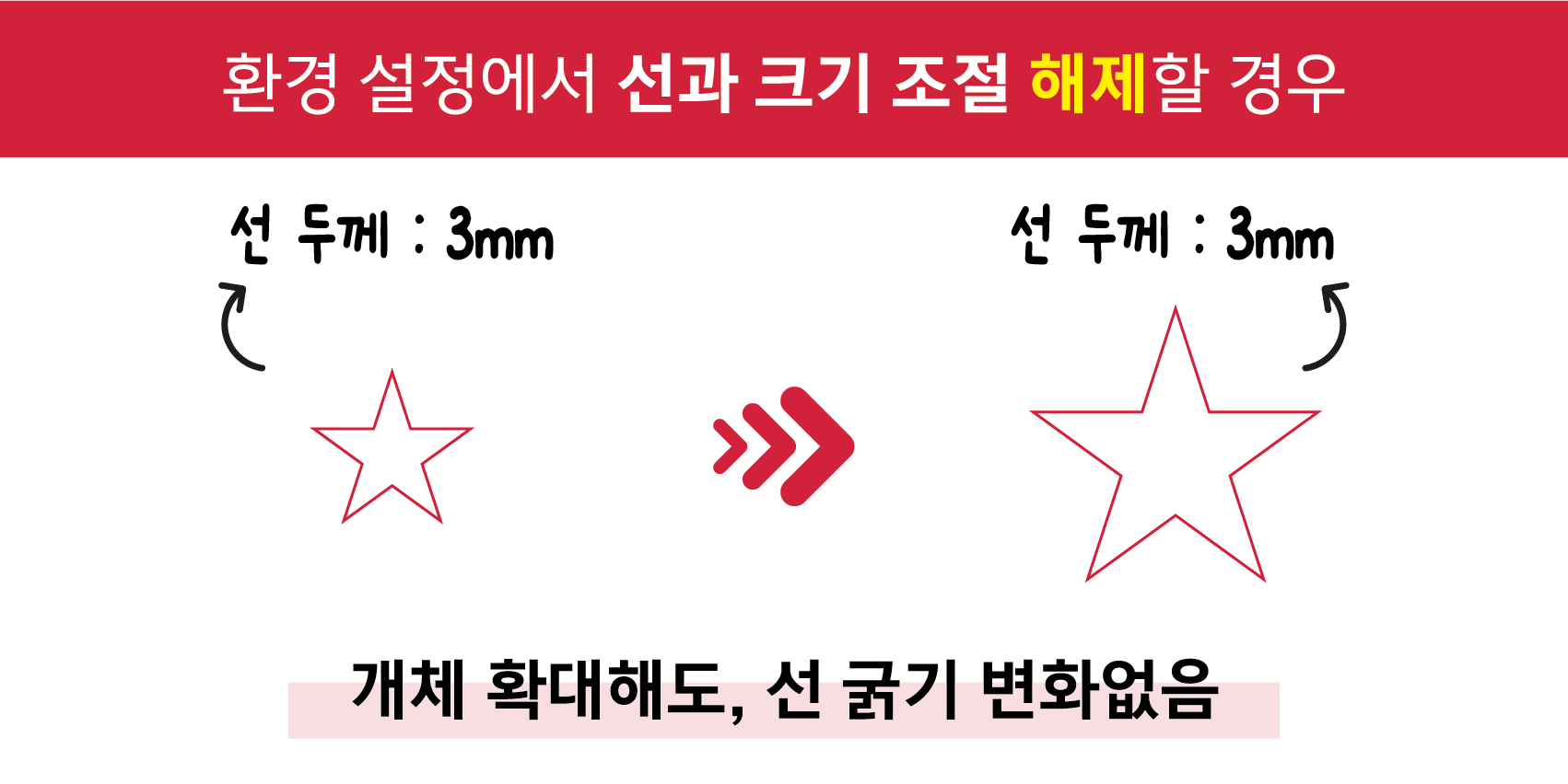 반면에 선과 크기 조절(Scale Stroke & Effects)을 해제했을 경우는 비율 유지가 가능해요. 개체를 아무리 크게 해도 선 두께는 변하지 않는 것을 확인할 수 있어요.