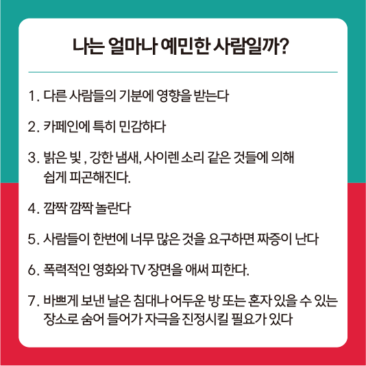 심리학자 Elaine Aron의 연구에 기반한 이 테스트는 당신이 과민한 사람(HSP)에 해당되는지에 대한 여부를 판별합니다.