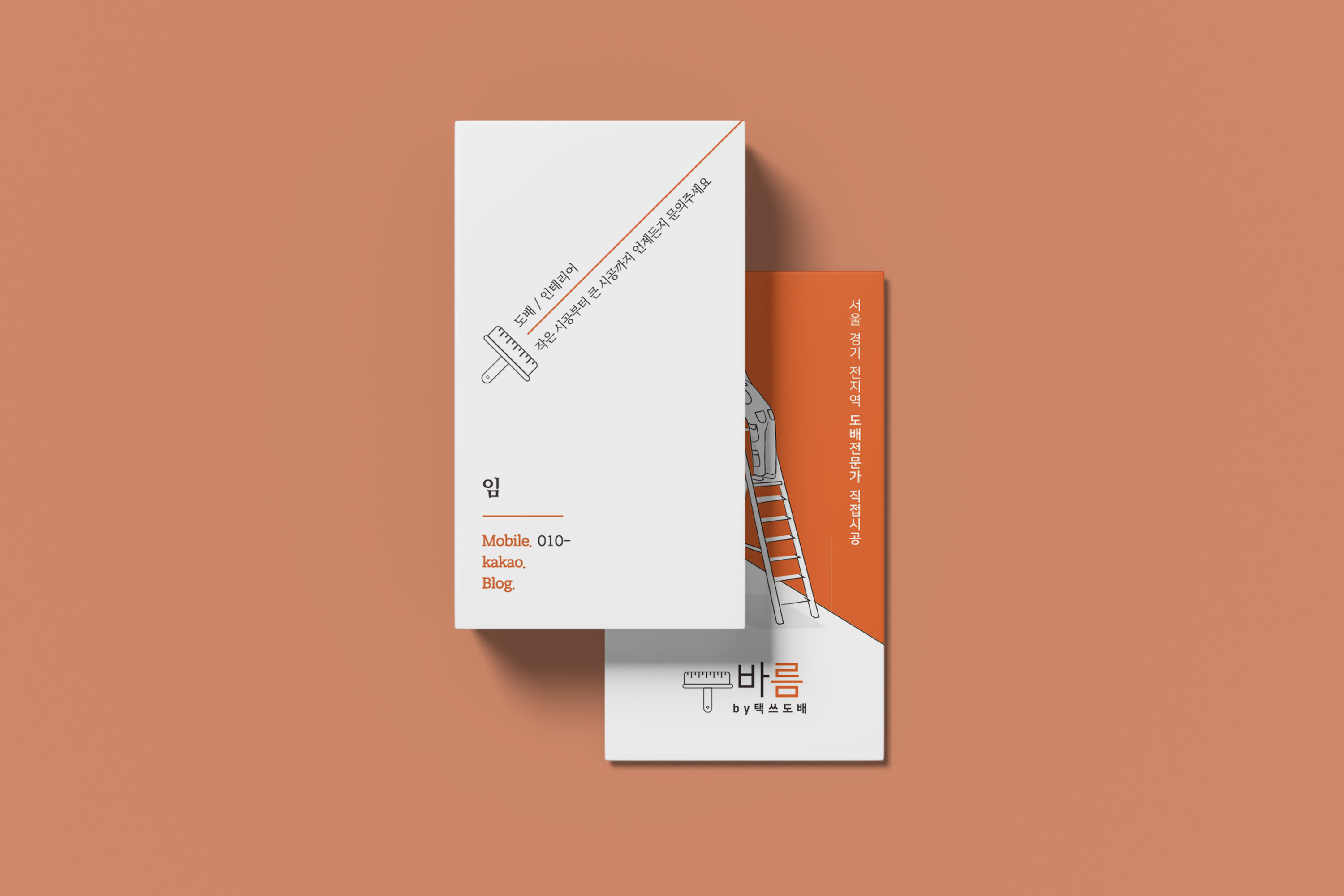 사실 초안에서는 [바름]이라는 브랜드가 직접적으로 연상시킬 수 있도록 명함 중앙에 도배 솔로 색칠하는 오브젝트를 배치했는데요. 관련해서 고객님과 이야기를 하다 더욱 직관적인 일러스트를 추가하는 걸 요청하셨죠.